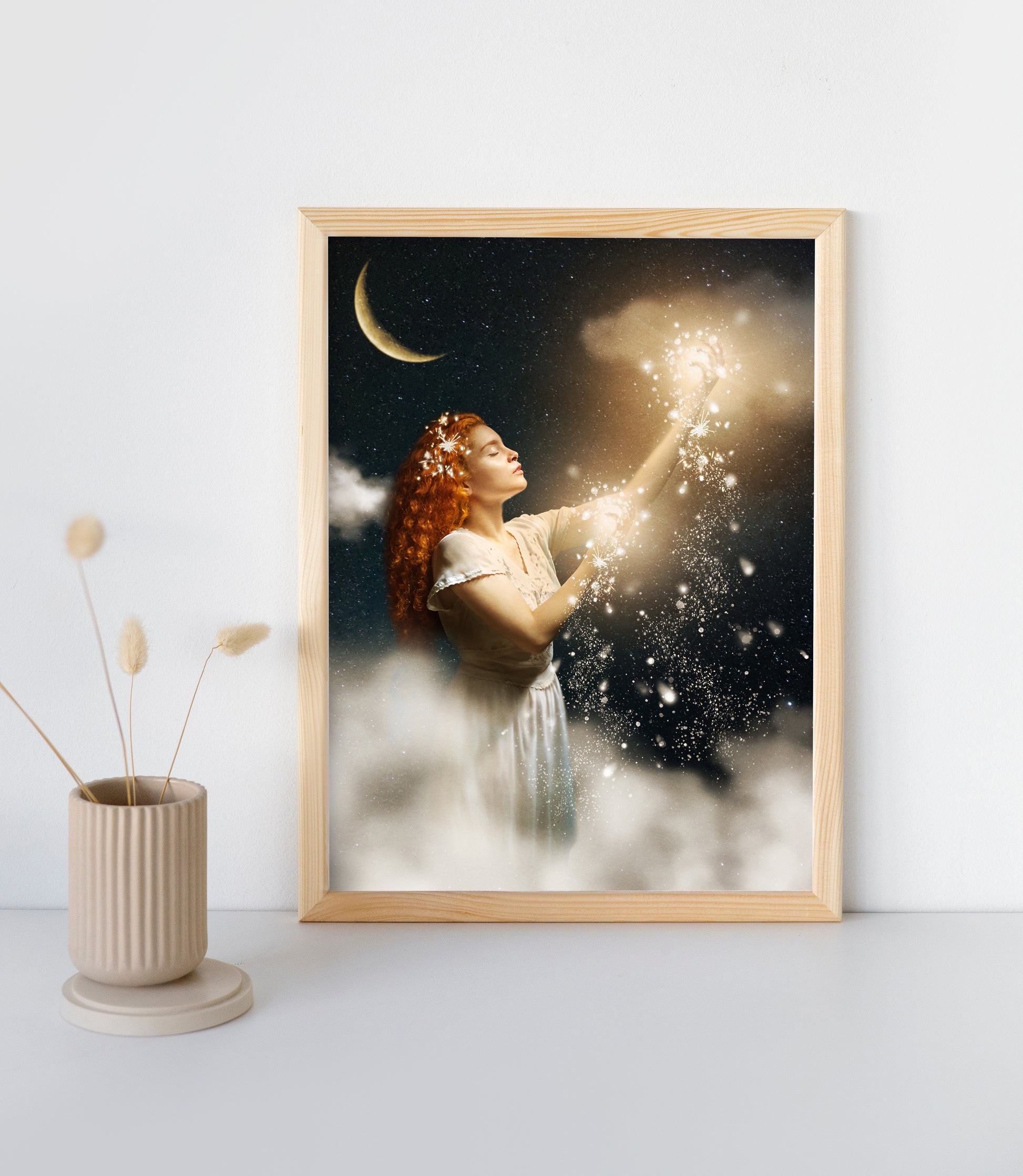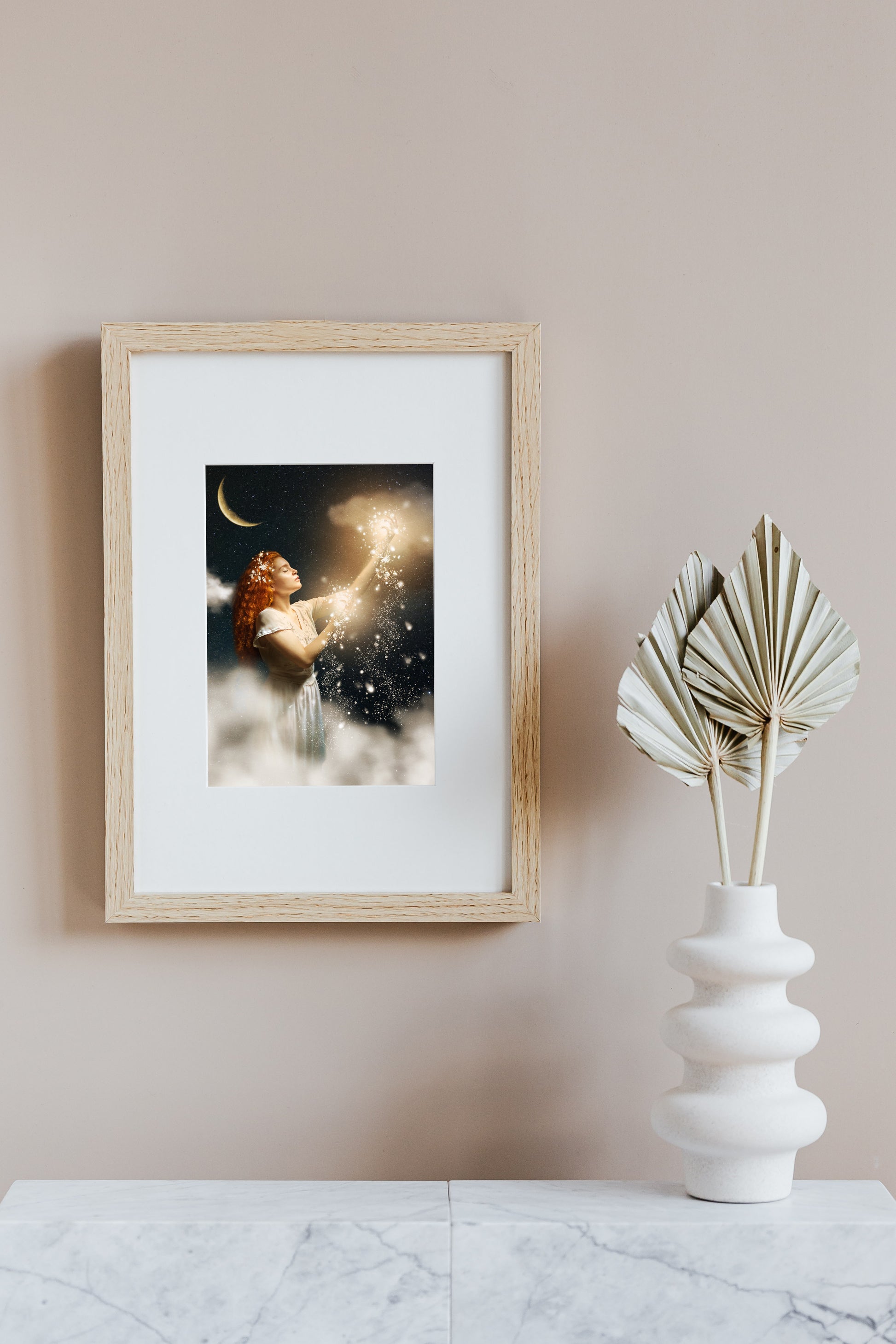 This mystical piece captures a radiant red-haired goddess suspended in the clouds beneath the velvet night sky. Her presence is otherworldly as she cradles a sparkling star gracefully in each hand. Astra is a beacon of the Divine Feminine, whispering the secrets of the cosmos to all who dare to dream. Surrounded by the constellations and moonlit mist, she reminds us of our own inner goddess, the one who shines brightest in the darkness.
